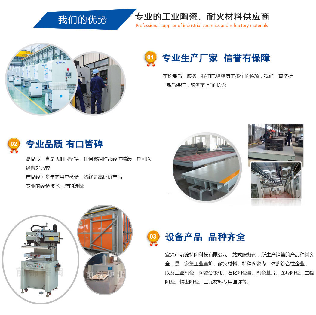 宜興市前錦特陶有限公司作為成員企業之一,公司主要生產工業陶瓷、窯具、匣缽、窯爐內襯系列。工業陶瓷以生產氧化鋯陶瓷、氧化鋁陶瓷、碳化硅陶瓷、氮化硅陶瓷等先進陶瓷為主;碳化硅制品有碳化硅異形件、三明治板、爐管等系列;耐火高溫窯具為剛玉爐管、剛玉莫來石制品、剛玉推板等產品;以及燒結墊板、氧化鋁空心球制品、sic板、石墨坩堝、堇青石復合莫來石板移進板、鋯粉、氮化硅陶瓷環(huán)、陶瓷棒、石化陶瓷管、陶瓷基片、磨介、分級輪和氮化硅球閥、熱電偶保護管、升液管等... ![]() |